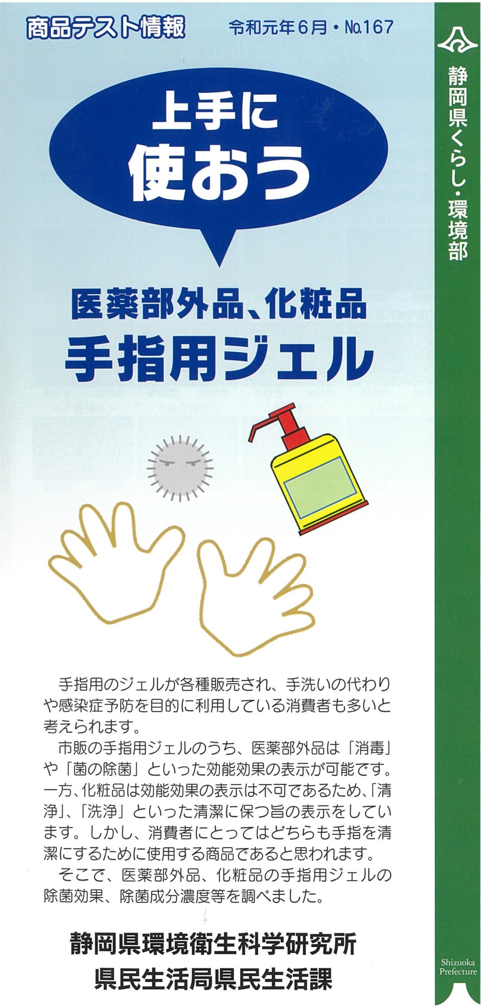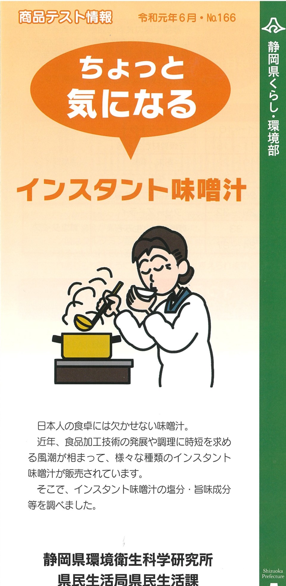 【県民生活課】商品テスト情報No.166&No.167 2019/09/17 静岡県環境衛生科学研究所/県民生活局県民生活課より、「商品テスト情報」No.166とNo.167が届きました。どうぞご覧ください。 ⇒こちらをクリック「商品テスト情報No.166 ちょっと気になるインスタント味噌汁」 ⇒こちらをクリック「商品テスト情報No.167 上手に使おう医薬部外品、化粧用手指用ジェル」