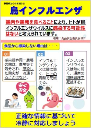 【静岡県衛生課】ちゃっぴーの食品安全インフォメーションR7-15「鳥インフルエンザ」 2025/11/22 静岡県(健康福祉部生活衛生局衛生課)では、「ちゃっぴーの食品安全インフォメーション」事業に取り組んでいます。 時々の食の安全に関する知識や注意喚起を、わかりやすく、簡潔にお知らせしていますので、どうぞご覧ください。 鳥インフルエンザ←こちらをクリック チラシのイメージ画像