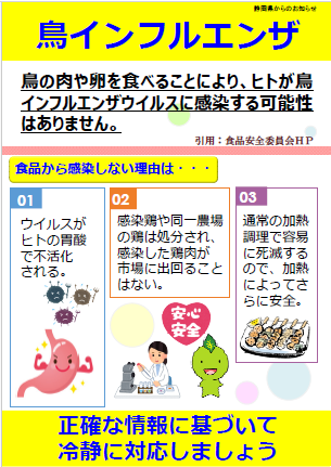 ・鳥の肉や卵を食べることにより、ヒトが鳥インフルエンザウイルスに感染する可能性はありません。