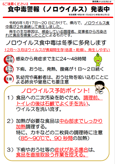 ⇒こちらをクリック「食中毒警報(ノロウイルス)発表中」←こちらをクリック