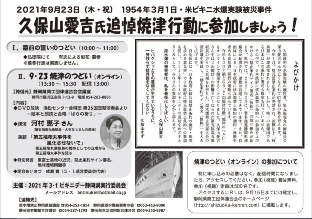 チラシ(A4サイズ横:1.10MB)はこちらから⇒ 2021年9月23日(木・祝)久保山愛吉氏追悼焼津行動に参加しましょう!