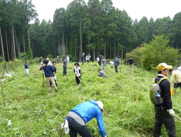 国際協同組合年を記念して、2012年5月12日に富士山麓にクヌギとコナラ250本を植樹してから3年が経ちました。以降、年2回継続して行っていた下草刈り活動を、昨年から活動を年1回としました。
