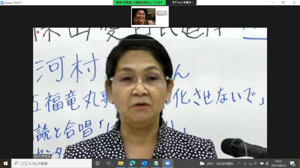 に続き、河村惠子さん(第五福竜丸元乗組員・故大石又七さんの義妹・写真)の講演「第五福竜丸事件を風化させないで」が行われ、大石又七さんの妻の妹としての経験やご自身の体験を語るに至った思いなどについて話されました。続いて県内各団体の活動が報告されました。