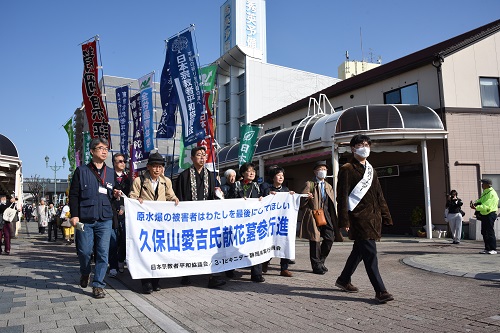 午前9時より開催された久保山愛吉氏献花墓参行進は、日曜日で好天ということもあり、県内外 から1,200名が参加しました。会員生協からは、ユーコープ、浜北医療生協が参加しました。静岡県生協連では献花用の赤いバラの花300本を用意し、ユーコープの組合員活動委員の協力で販売しましたがあっという間に完売。弘徳院では宗平協が主催し墓前祭が行われ、久保山さんの墓前に多くの方が手を合わせました。