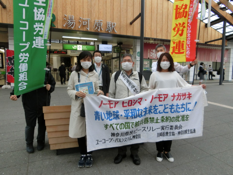 神奈川県ピースリレー実行委員会を代表し井上理事から「昨年まで4年にわたりヒバクシャ国際署名に取り組み56万筆が寄せられました」「今ある平和のありがたみ、命の大切さを知り、すべての子どもたちが健やかに成長できる、核兵器のない世界の実現が被爆者のかたや私たちの願いです」とあいさつが述べられました。