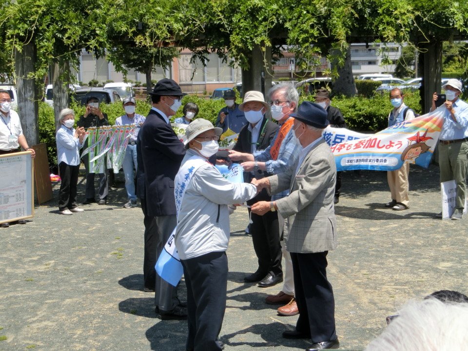 続いて平和行進横断幕が静岡県代表(大和忠雄さん(静岡県原水爆被害者の会会長)、木藤功さん(原水爆禁止静岡県協議会理事長)、稲垣滋彦さん(静岡県生活協同組合連合会会長))から愛知県代表に手渡され、愛知県平和行進実行委員会を代表し、沢田昭二さん(原水爆禁止愛知県協議会理事長)から歓迎のあいさつがのべられました。