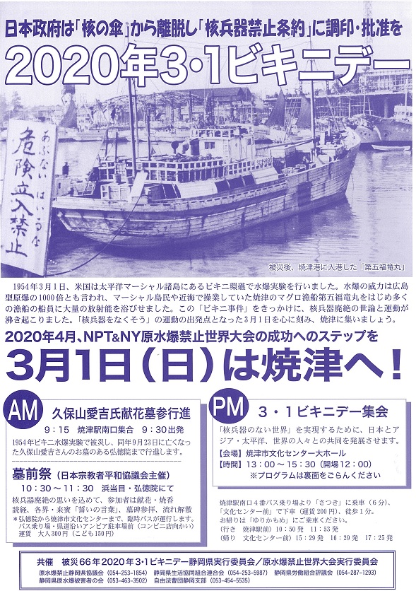 (お知らせ)2020年3・1ビキニデーが開催されます 2020/01/10 1954年3月1日のビキニ環礁で水爆実験が行われてから今年で66年になります。 毎年3月1日前後に「ビキニ事件」を記念した行事が焼津市内外にて開催されています。 2020年3月1日(日)は、午前中に「久保山愛吉氏墓参行進」と「墓前祭」が、午後に「3・1ビキニデー集会」が開催されます。 どうぞ3月1日の焼津行動にご参加ください。 昨年の様子はこちら